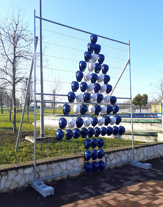 Il progetto, ideato dal maestro Francesco Sbolzani per la Fondazione Anmil “Sosteniamoli Subito”, è stato realizzato grazie alla collaborazione Sistedil – Sistema Edile per la formazione e la sicurezza della Provincia di Alessandria e al contributo dei caschetti messi a disposizione da Buzzi Unicem, successivamente trasformati in elementi costruttivi dell’opera.