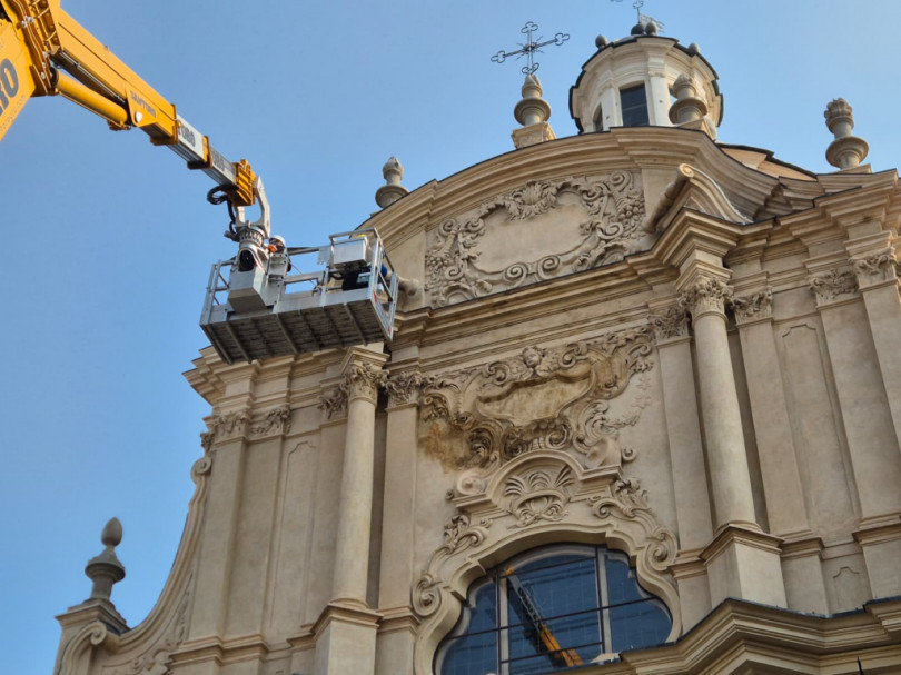 Nei mesi successivi a giugno 2023, conclusi i lavori di restauro della facciata, abbiamo osservato che alcuni elementi dell’architettura risultassero più esposti di altri agli eventi atmosferici. In questi giorni ci siamo concentrati sull’asportazione con biocida di muffe e altri organismi che avevano ricominciato ad attaccare la facciata in modo puntuale e sull’applicazione di protettivi. All’interno, sui dipinti della cupola, ottimizzando l’uso della piattaforma dedicata al cantiere degli impianti, sono state verificate alcune fioriture di sali che si erano prodotte lo scorso anno. All’esterno nel 2024 era stata immediatamente condotta una verifica e la riparazione di alcune microlesioni ed effettuate nuove saldature su punti dubbi del manto. Tutte le macchie sui dipinti sono risultate asciutte. L’attenzione costante che La Fabbrica di Santa Caterina ETS usa alle più piccole modifiche dello status quo è il vero modo di prendersi cura della nostra magnifica chiesa.