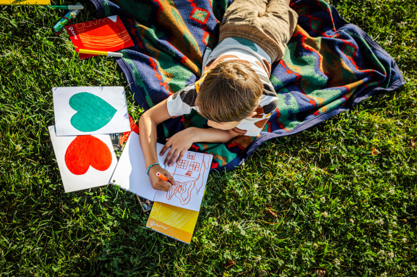 - Ambiente nello zainetto: bambini che osservano la natura con una lente d’ingrandimento, stimolando curiosità e consapevolezza;