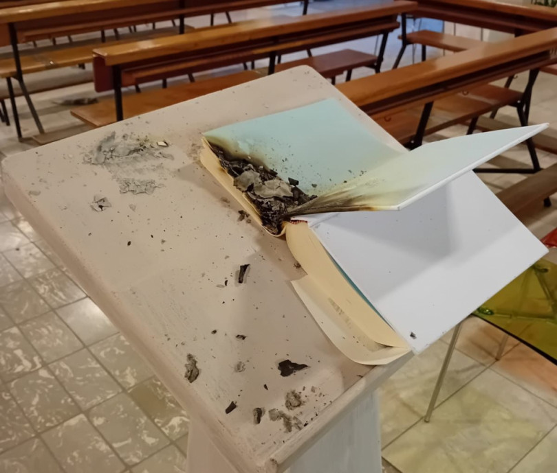Il Libro della Parola di Dio, cuore della liturgia e segno della presenza viva del Signore che parla al suo popolo, è stato deliberatamente dato alle fiamme. L’edificio sacro è stato inoltre sporcato e lasciato in disordine, profanando un luogo che è spazio di preghiera, di comunione e di speranza per la comunità cristiana.