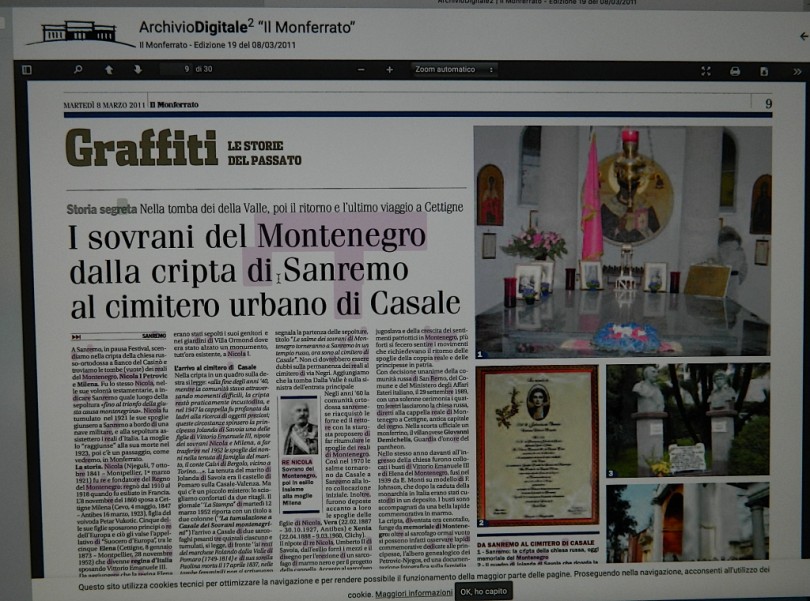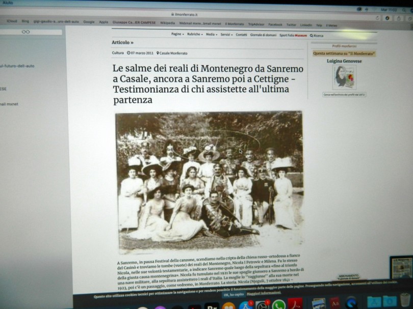 Un coinvolgimento dovuto al fatto - come abbiamo più volte scritto- che le spoglie del sovrano montenegrino, e della moglie regina Milena Vukotic, genitori della regina Elena, furono ospitate dal 1952 al 1970 nel cimitero casalese (tomba Dalla Valle, alla destra dell’enttrata provenienti dalla chiesa russa di Sanremo dove in quel momento la cripta mancava di condizioni di sicurezza. Ora sono alla cappella reale di Cettigne (antica capitale del Montenegro).