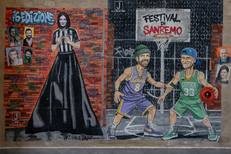 Nell’opera Carlo Conti, Laura Pausini e i co conduttori diventano protagonisti in versione basket, tra riferimenti pop, satira e memoria urbana. Un pensiero finale anche alle vittime di Crans Montana, ricordate con 41 farfalle. Nell'attesa della seconda serata del Festival della Canzone Italiana, vi regaliamo qualche scatto realizzato da Alessandro Ghisoni.
