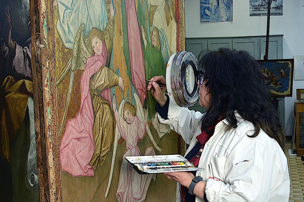 FOTO. Anna Rosa Nicola restaura ad Aramengo una delle tavole di Vezzolano.